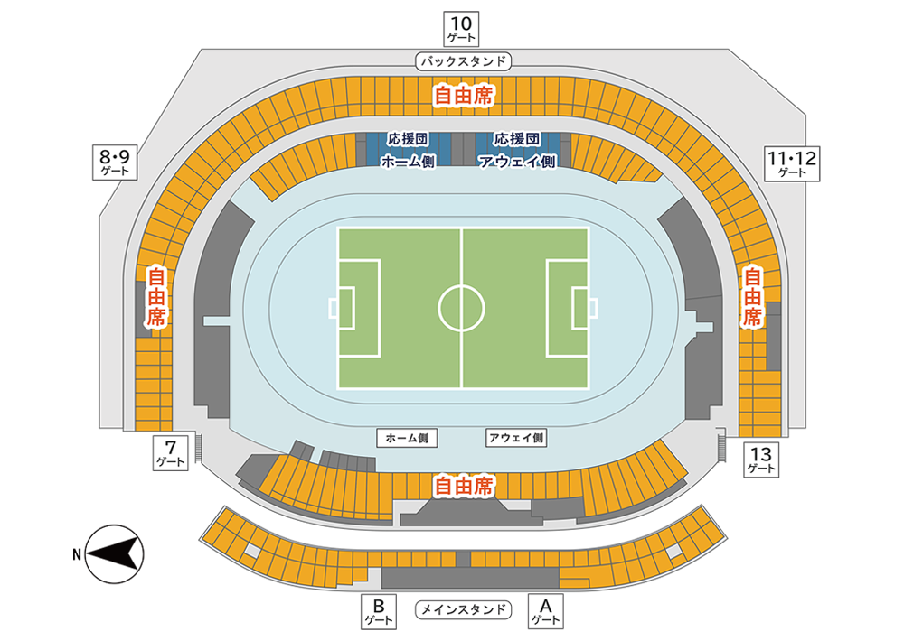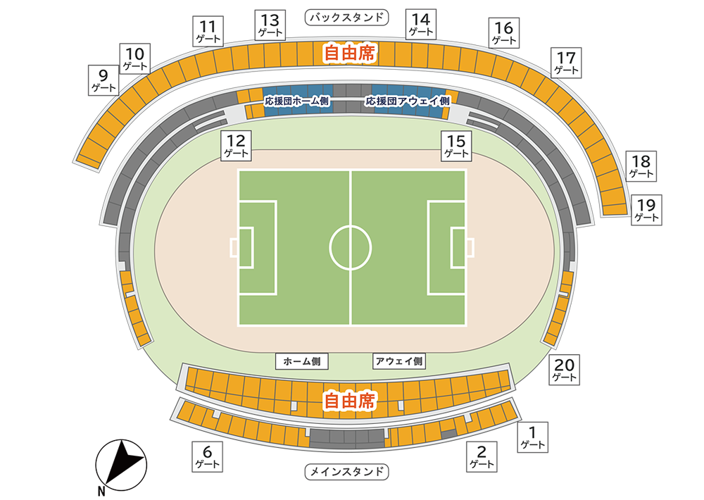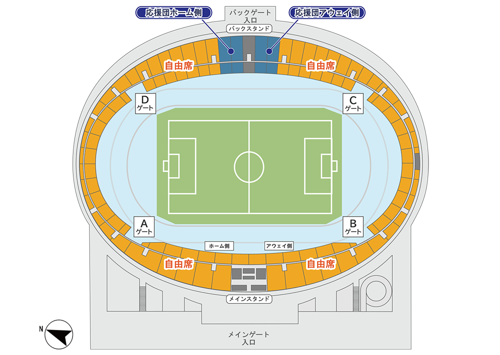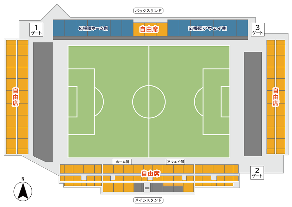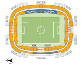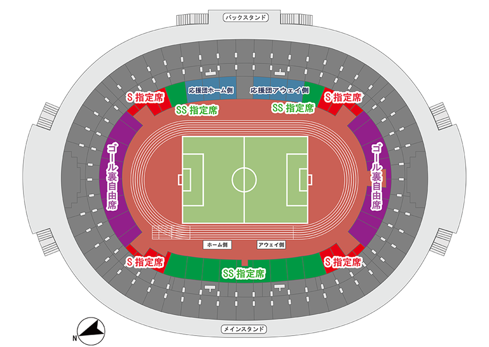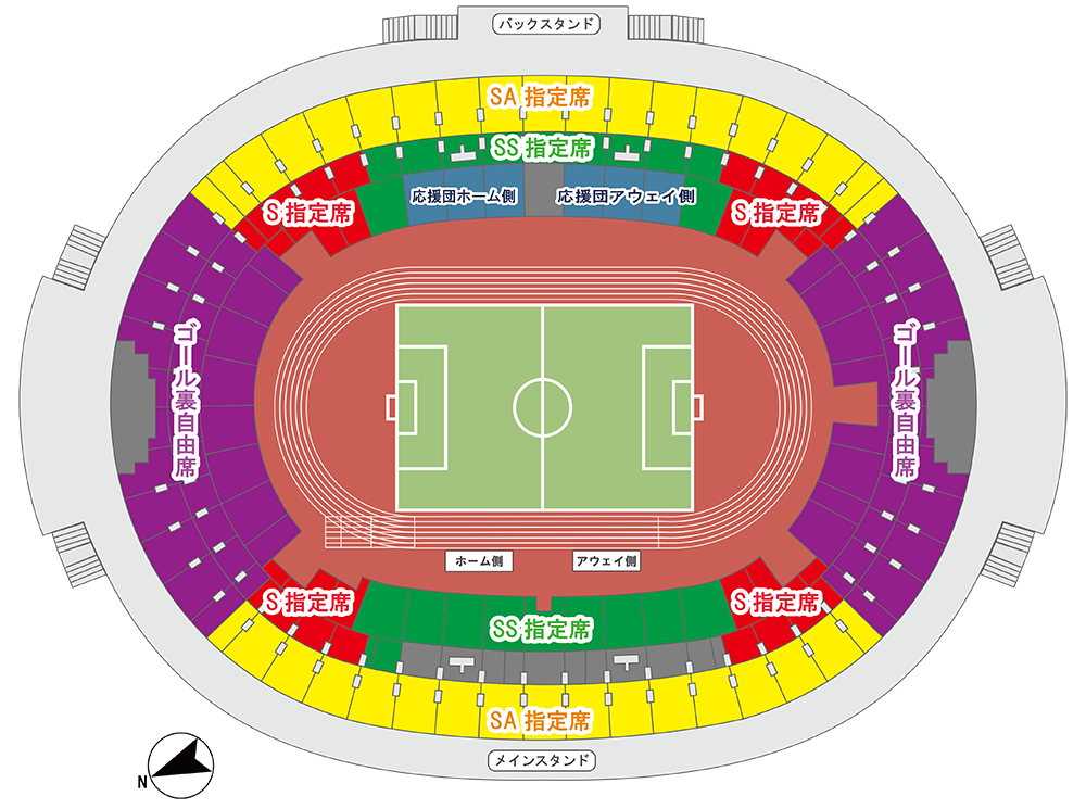 ※ SS指定席・SA指定席は、「北側」「中央」「南側」、S指定席・ゴール裏自由席・車いす席は「北側」「南側」からエリアを選択いただけます。