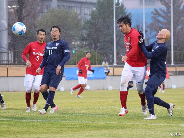 横浜シニア(関東3/神奈川)とセレソン長野シニア(北信越1/長野)の準決勝は、互いに開始2分までに決定的なシュートを放つ展開となりました。開始早々の横浜シニアの一撃はゴールポストを叩きますが、その1分後、セレソン長野の片山真人選手がゴールネットを揺らし、この1点がそのまま決勝点となりました。もう一方の準決勝では、GK矢谷和裕選手のセーブなどで粘っていた広島四十雀サッカークラブ(中国/広島)を相手に、エリース東京が残り10分を切ってから2得点。2年ぶりの決勝へと駒を進めました。