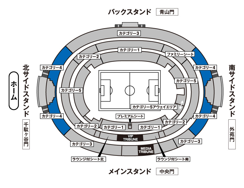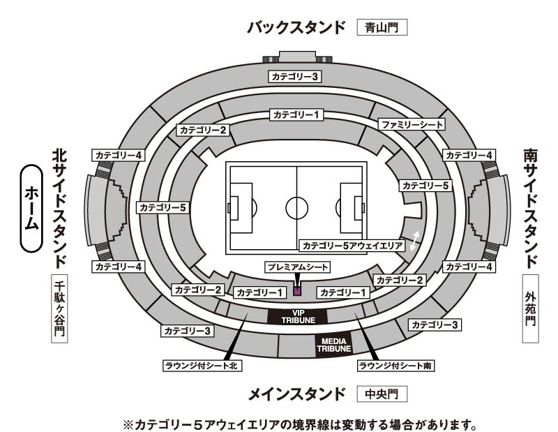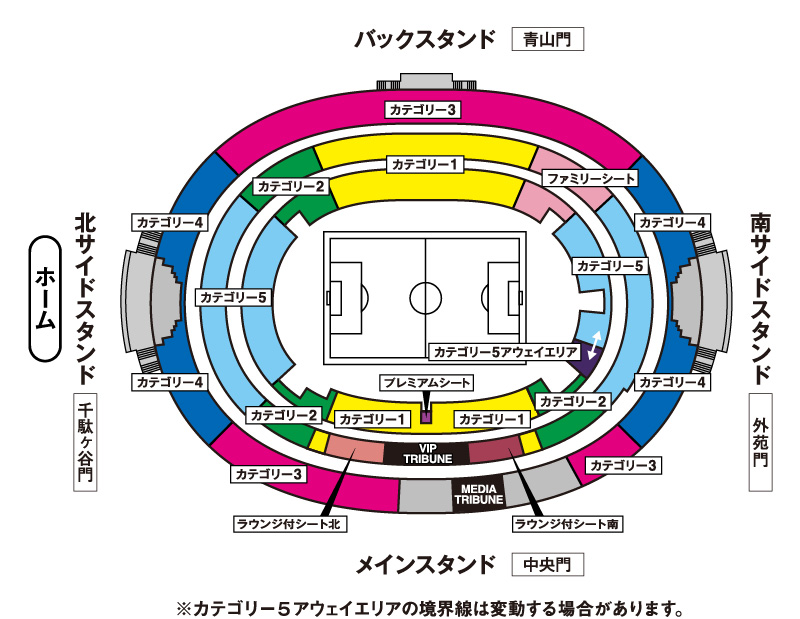 - ・カテゴリー5(ゴール裏・南1階)とカテゴリー5(ゴール裏・南1階アウェイエリア)の境界線は変動する場合があります。