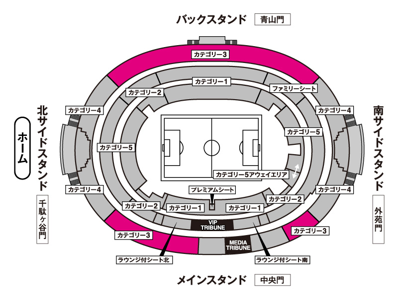 - ・カテゴリー5(ゴール裏)は立ち上がって応援するサポーターがいらっしゃる場合があります。そのため、着席しての観戦を希望するお客様は、カテゴリー5以外のエリアでの観戦をお勧めします。