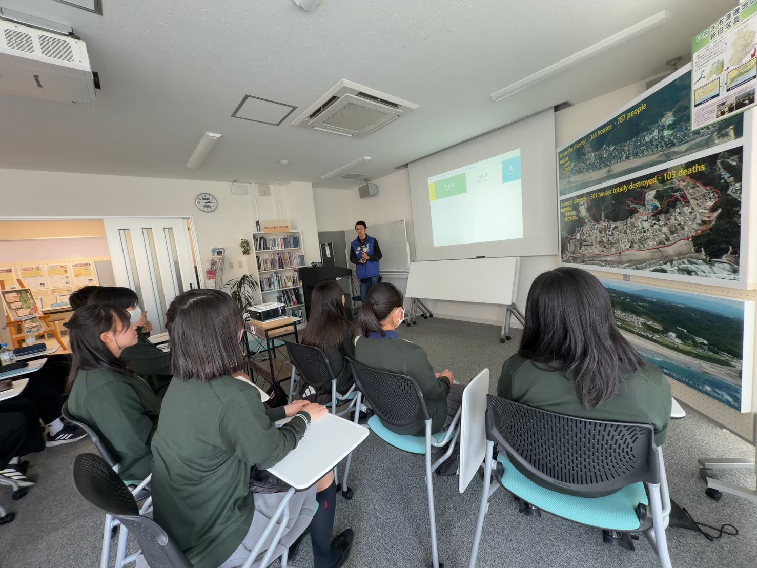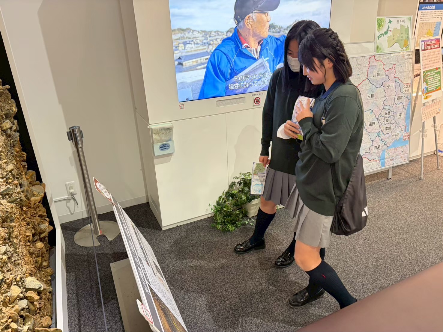 いわき市震災伝承みらい館では、地震や津波の大きさを映像や写真で知ることができました。特に地震の影響で地面がずれている剥ぎ取り標本を見てとても驚きました。また、東日本大震災の日は卒業式だったので、当時の黒板がそのまま残っていて、一人ひとりの言葉が書かれていました。地震が起こるのは突然だということも理解することができました。また、語り部の方から話を聞いて実際に経験した人にしかわからない地震の恐ろしさを知ることができました。語り部の方が撮影した映像では津波が迫ってきていて、最初は低い波でもその数分後にはとても高い波として追ってきていました。その映像を見て、地震や津波が来たら自分の命を守るにはすぐ逃げなければならないことがわかりました。映画「Fukushima50」では、原子力発電所で働いていた人たちが命がけで事故を止めようとしていたことを知りました。とても危険な現場にいる中でも日本、そして地元双葉郡を守るために働いた現場の人たちは本当にすごいと感じました。このような人たちのおかげで、今私たちは福島県楢葉町で生活をし、サッカーができているという大切なことにも映画のおかげで気付くことができました。