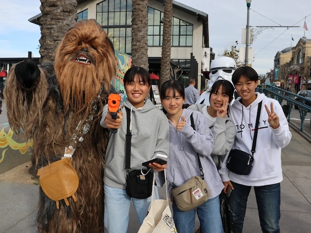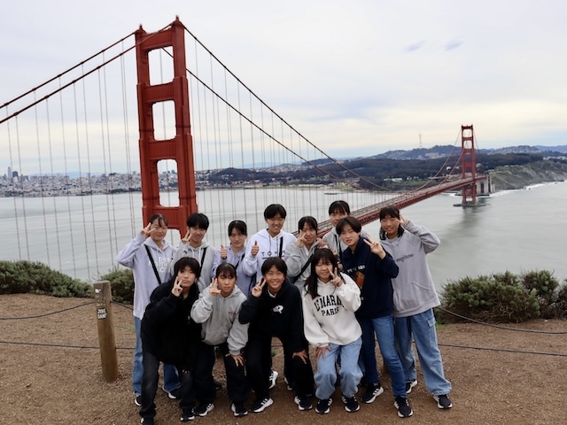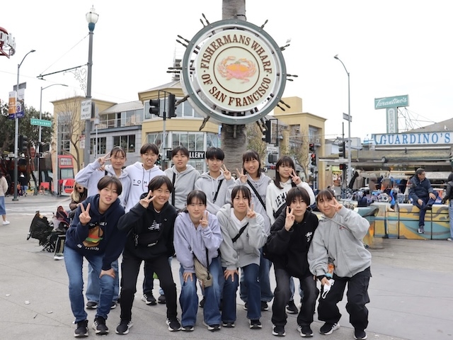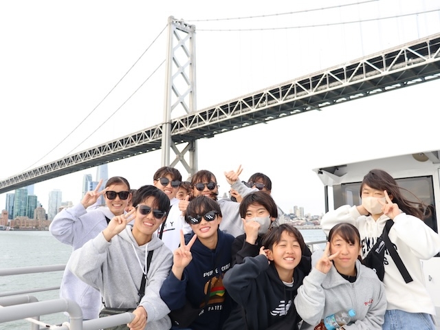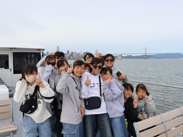 今日はサンフランシスコで観光をしました。初めに船に乗りました。途中から船のスピードがとても速くなってみんな髪の毛が崩れてましが、サンフランシスコの街が見えて来ると景色がとても綺麗でたくさん写真を撮りました。次にゴールデンゲートブリッジに行きました。今までに見たことの無い景色を味わうことができました。アメリカには明石海峡大橋みたいに大きな橋が沢山色々な場所にありました。ゴールデンゲートブリッジの後は2時間ほど自由行動でした。欲しいものが沢山あったけど全部買うとお金が足りないのでしっかり計算しながら買うことができました。最後にみんなでケーブルカーに乗りました。加藤さんが運転手さんにからかわれて、他の乗客たちに紹介されてみんなは大笑いをしていました。アメリカの人はとてもコミュニケーション力が高いなと思いました。私たちは英語があまり得意ではないですが、話すことができるようたくさんの人と残りの時間を大切にたくさん話していきたいなと思います。