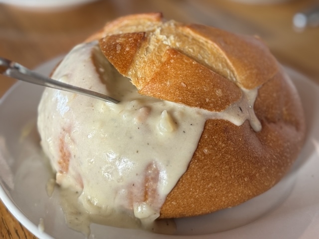 ここでは、くり抜いた大きなパンの中に入ったクラムチャウダーがとても有名ですが、お土産にお金を残しておきたかったようでご飯は節約して最後まで家族や友達へのお土産をたくさん買い込んでました。