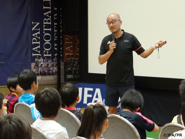 日本サッカーミュージアムでは、現在開催している小中学生の自由研究対策イベントの一環として、小中学生のみなさんにサッカーをさまざまな角度から知ってもらうためのトークイベントを実施しています。8月17日(月)には第7回目のトークイベントを開催し、SAMURAI BLUE(日本代表)アスレティックトレーナーの前田弘さんに、育成年代の選手によくみられるケガと、その予防や処置の仕方についてお話いただきました。また、ケガ予防のためのストレッチや足関節のトレーニング方法を紹介していただき、実際に参加者全員でやってみました。最後は、「日々の生活での行動が、重要なときに必ず出てくる」というオシム元日本代表監督の言葉を引用し、日常の行動がいかに大切かというお話で締めくくっていただきました。