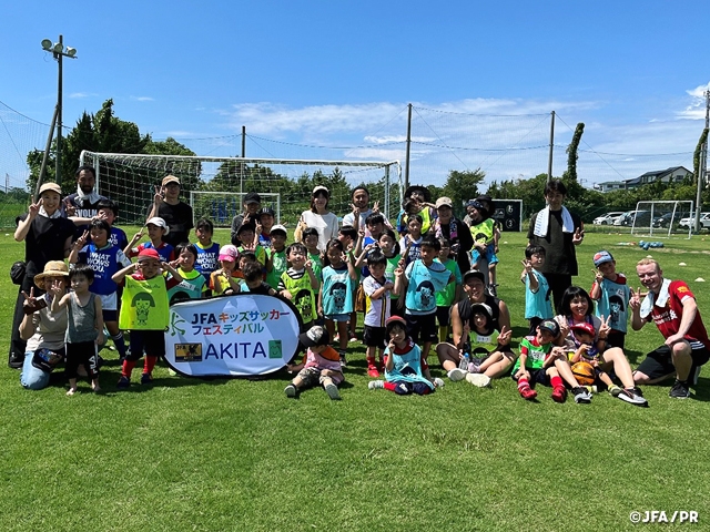また、子どもたち同士はもちろん、保護者を含めた「親子交流」も1つのプログラムとして組み込み、2日間で子どもから大人まで約170名が秋田中央スポーツセンターに集い、天然芝の上を駆け回って汗を流しました。