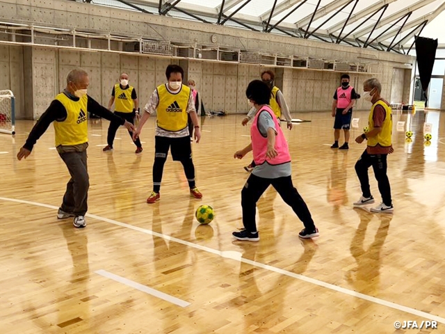5月27日(金)の午後に高円宮記念JFA夢フィールドにて、ウォーキングフットボール(歩くサッカー)を楽しめる“ウォーキングひろば”を開催しました。予定では屋外の人工芝ピッチで行うことになっていましたが、前日からの雨のため、屋内施設のフットサルアリーナに変更して行いました。