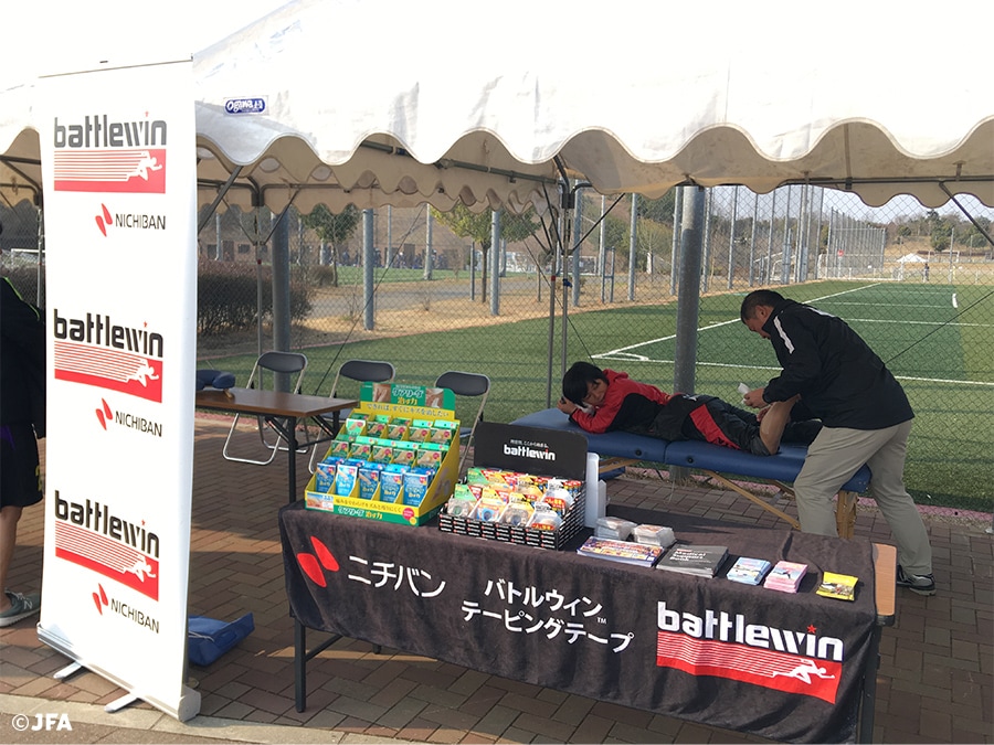 また、ニチバン様の課題解決策として、シニア大会を含めたJFAの各種カテゴリーの大会でテーピングブースを出展していただいています。ニチバン様の契約トレーナーの方々が、大会に参加する選手たちにテーピングを実践し、アドバイスをしていただいています。われわれとしても正しい怪我予防の啓発に繋がるのでありがたいですね。