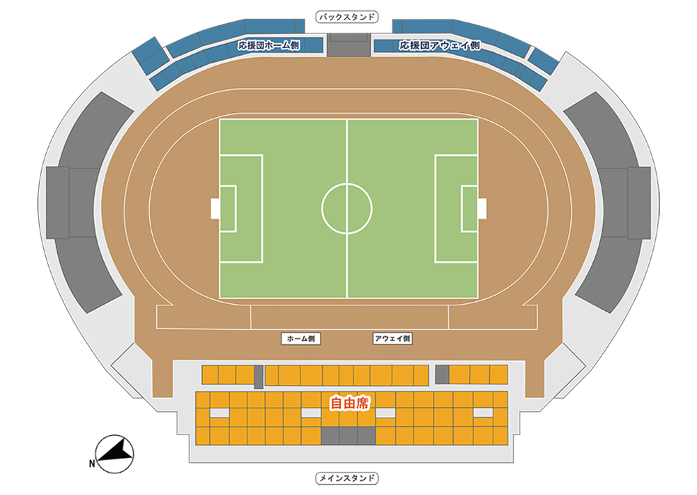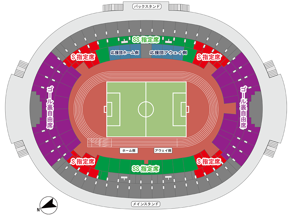 ※ SS指定席・SA指定席は、「北側」「中央」「南側」、S指定席・ゴール裏自由席・車いす席は「北側」「南側」からエリアを選択いただけます。