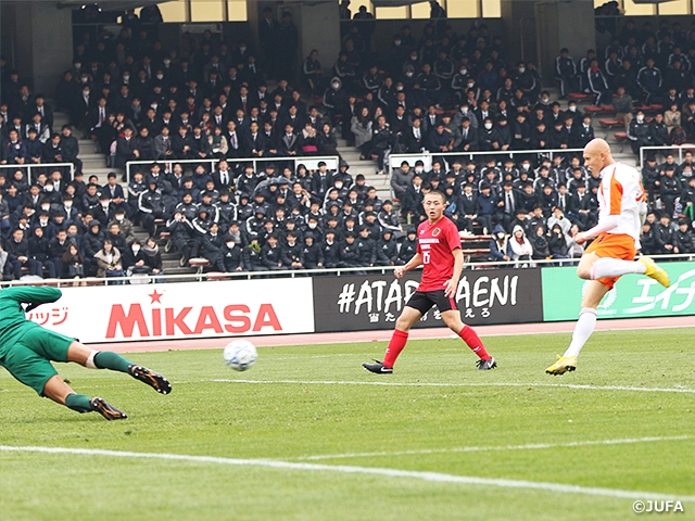 駒澤大学はハーフタイムに、準決勝で負傷した坂本和雅選手を下げて矢崎一輝選手を投入。54分にも安藤翼選手に代えて高橋潤哉選手をピッチに送り出すなど、早めの選手交代で流れをつかもうとします。しかし法政大学も、後半に入ると紺野和也選手のドリブル突破などでサイドから揺さぶりをかけると、60分にU-21代表のFW上田綺世選手を投入。「肩を負傷しているため時間限定の出場だった」(法政大学・長山一也監督)というエースの投入で一気に攻勢に出ます。すると72分に試合が動きます。法政大学はボランチの大西遼太郎選手のパスを受けた森俊貴選手がミドルシュート。このシュートはクロスバーを叩きますが、跳ね返ったボールをディサロ燦シルヴァーノ選手が右足でダイレクトに押し込み、法政大学が先制します。