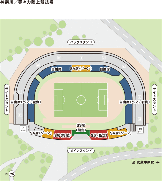 ■東急、JR「武蔵小杉」駅北口より、バス「溝の口方面」行きで「市営等々力グランド入口」下車、徒歩5分