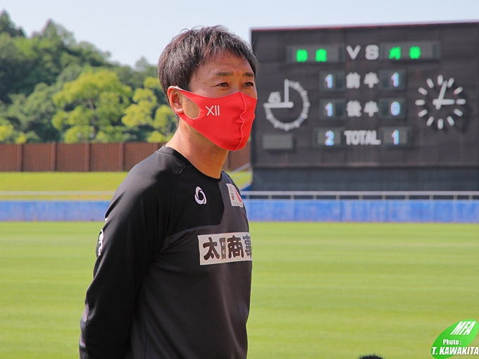 試合終了後の記者会見は新型コロナウイルス対策で屋外で行いました