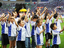 たくさんのお客さんが見守る中、あこがれの選手たちと手をつないでピッチに入場します。キックオフ直前のピッチの緊張感を味わうことができますよ。