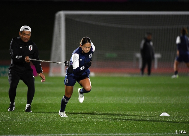 練習前には池田太監督と南萌華選手(ASローマ/イタリア)がウェリントン・リージョナル・スタジアムで前日会見に臨み、池田監督は「スペインも我々もノックアウトステージ進出を決めていますが、集中力を継続させていくため、スペイン戦を次のノックアウトステージのために利用する感覚はなく、しっかりと規律を持って戦いたい」と意気込みました。ここまで2試合にフル出場し、無失点に貢献している南選手は「私自身、FIFA U-17、20女子ワールドカップでスペインと決勝戦を戦ってきました。スペイン戦は毎回、決勝戦の気持ちで戦っているので、相手をリスペクトし、私たちのよさを出して全力でぶつかっていきたい」とライバルとの一戦を見据えました。