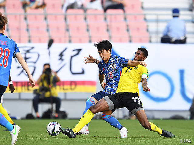 ジャマイカのフル代表を迎えて行われた今回の国際親善試合は、本大会に臨む最終メンバー18名を発表する前に行われる最後の試合であり、5月31日から続いた活動の締めくくりとなる一戦。また会場には新型コロナウイルスへの対策から人数を制限した形ではあったものの、ファン・サポーターの皆様を迎えることができ、心のこもった拍手や、熱い思いを込めた横断幕の掲示などがあり、選手の士気も自ずと高まった。