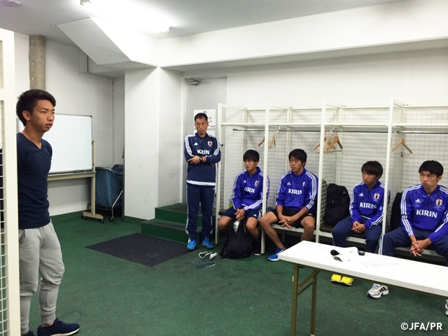 メンバーを大幅に入れ替えた日本は後半、パスミスが目立ち相手に攻撃を仕掛けられる場面が増えます。その辛い時間帯を耐えると、87分にはFW一美和成選手が相手陣内の右サイドで粘り強いデイフェンスでボールを奪い、ゴール前にドリブルで侵入、ゴール前に走りこんでボールを受けたMF岩崎悠人選手が相手の状況を見ながら落ち着いてシュート。これが決まり、日本は3-0でジュビロ磐田に勝利しました。試合後には昨年U-19日本代表でAFC U-19選手権に出場した川辺駿選手(ジュビロ磐田)がロッカールームに訪れ、これから予選に出場する選手に激励の言葉をかけました。
