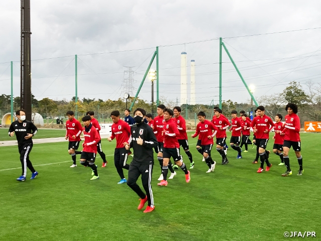 U-18日本代表候補は今年最初のトレーニングキャンプを、3月25日(木)からJヴィレッジにて開始しました。昨年の春先から新型コロナウイルスの世界的な感染拡大の影響でサッカー界のみならず、スポーツ界全体、さらには社会全体が生活する上でもさまざまな制約や制限を強いられてきました。1つ上の年代カテゴリーとなるU-20日本代表は目指していたFIFA U-20ワールドカップ2021が残念ながら中止となりました。ただし、多くの海外チームが同カテゴリーの活動を解散する中、技術委員会で協議し、育成年代日本代表活動でしか経験できない国際試合、同年代選手から得る刺激、そして何より将来のSAMURAI BLUE(日本代表)・オリンピック出場を目指す代表に1人でも多くの選手を輩出すべく、歩みは止めてはいけないと、各年代別カテゴリーの活動は継続する決定し、このチームは2年後にインドネシアで開催されるFIFA U-20ワールドカップ2023優勝を目指し、国内外で強化を続けていきます。まずは、来年に開催されるAFC U-19選手権ウズベキスタン2022予選突破に向けて、チームを一から作っていきます。