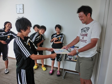ミーティング後選手はサプライズで西入コーチをお祝い。
