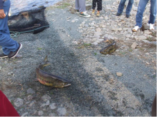 網と共に岸辺に寄せられていきます。中には産卵後死んでしまっている鮭も・・・。