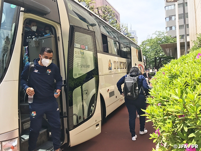 4月11日(日)に国立競技場で開催される国際親善試合でなでしこジャパンと対戦するパナマ女子代表が8日(木)に来日しました。全ての選手、スタッフや関係者の健康と安全・安心を第一に徹底した感染対策を実施しており、選手たちは出国72時間前以内に行った検査で陰性を確認した上で入国。空港内でも抗原検査がありました。