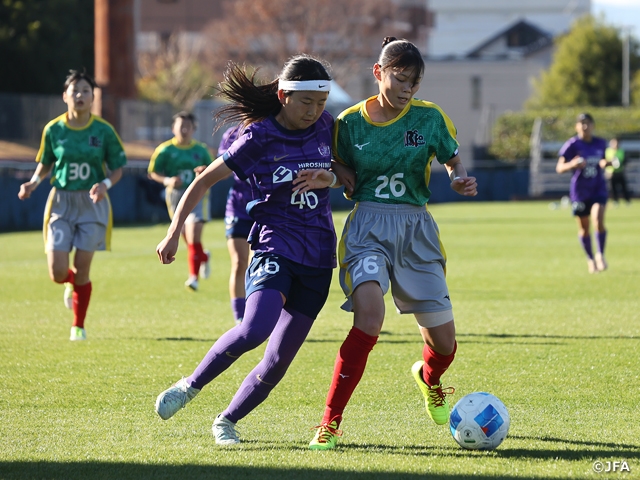 後半も主導権を握る広島は、攻撃の手を緩めることなく相手ゴールに迫ります。43分には「誰よりも得点を挙げ、スタメンを取り返そうという気持ちで試合に入った」と言うMF関山麗月選手が得点をマーク。その関山選手をはじめ交代枠を活用しながら試合を進める中、「ベンチに下がった選手がみんな声を出してくれて、雰囲気が最高潮だった」(関山選手)ことで攻撃の勢いがさらにアップします。同じく途中出場のMF清水杏奈選手も得点を挙げるなど後半も攻め続けた広島が、うれしい全国大会初勝利を手にしました。