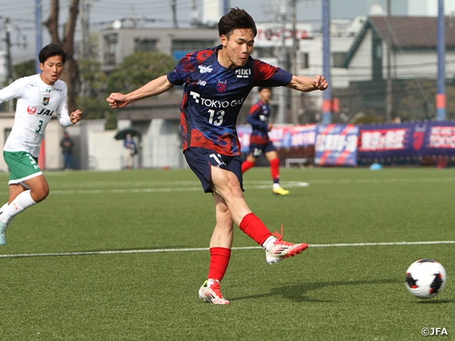 これで勢いに乗ると、13分にはMF友松祐貴選手(#10)のスルーパスにFW樋口佳選手(#13)が反応して抜け出します。「友松選手が顔を上げた瞬間に、裏を取れると思って走り込んだ。あの角度からのシュートはずっと練習していて、その成果が出た」(樋口選手)という右足のシュートはポストに当たりながらもゴールに吸い込まれ、FC東京がリードを広げます。