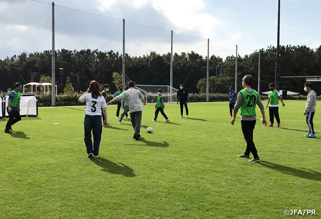 最後には、代表選手が使用している青々としたピッチで自由時間を設け、芝生の上を歩いたり、ボールを蹴ったり、写真撮影をしたり、ウォーキングフットボールをしました。ウォーキングフットボールでは、走ってはいけない、相手のボールは奪いにいってはいけない、点が決まったらみんなでエアハイタッチをする、というソーシャルディスタンスルールも取り入れ、サッカー初心者の方でも楽しんでいただけたようです。OB選手とも写真撮影をし、みなさん笑顔で高円宮記念JFA夢フィールドを後にしました。