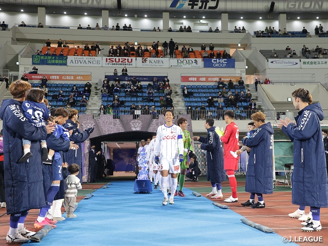 再び音楽が流れ、この試合でキャプテンを務めた野澤英之選手を先頭に白いユニフォーム姿の甲府の選手たちが1列で入場します。拍手で迎える町田の選手たち。冷え込んだ水曜日の夜の試合で入場者はそう多くはありませんでしたが、観客席からも惜しみない拍手が送られました。