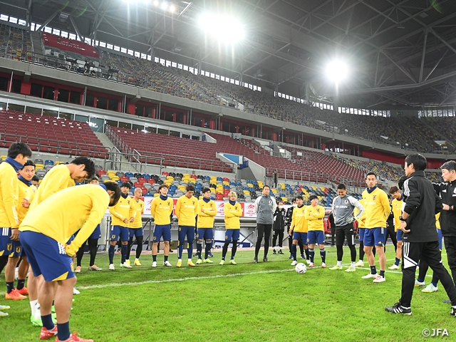 SAMURAI BLUEの選手たちはこの日午後、試合会場で公式練習に臨み、冒頭15分以外を非公開にしてプレーの最終確認を行いました。