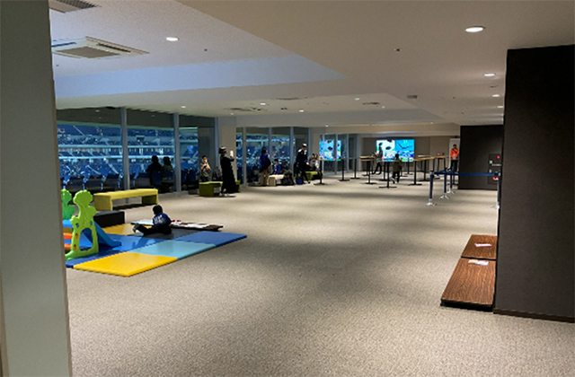 - ファミリーシートは屋外観戦のできるバルコニー席と屋内のラウンジからなる、バックスタンド側の特別室です。ラウンジにはキッズスペースもあり、お子様連れの方におすすめです。