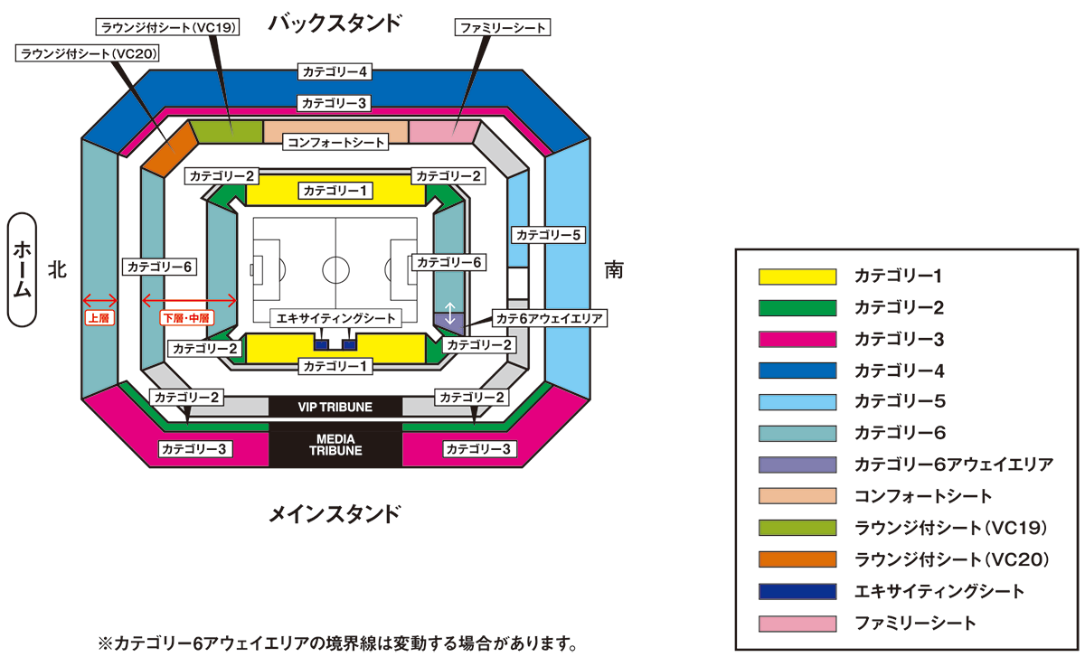 - ・カテゴリー6(ゴール裏・南下層)とカテゴリー6(ゴール裏・南下層アウェイエリア)の境界線は変動する場合があります。