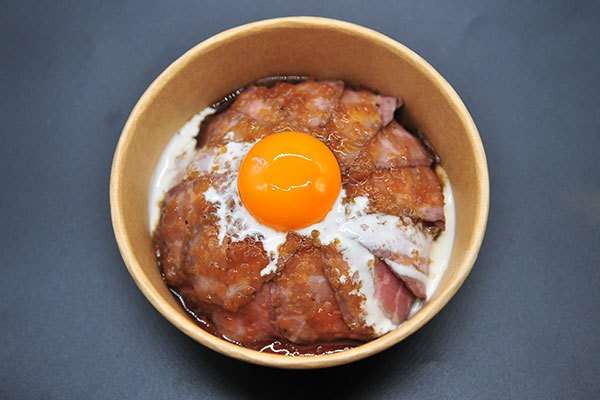 お肉屋さんのローストビーフ丼です。甘みのある玉ねぎソースと酸味のあるヨーグルトソースがお肉の甘みを引き出す商品です。仕上げにお肉の上にのせる卵黄が黄金のように輝き写真映えする商品です。