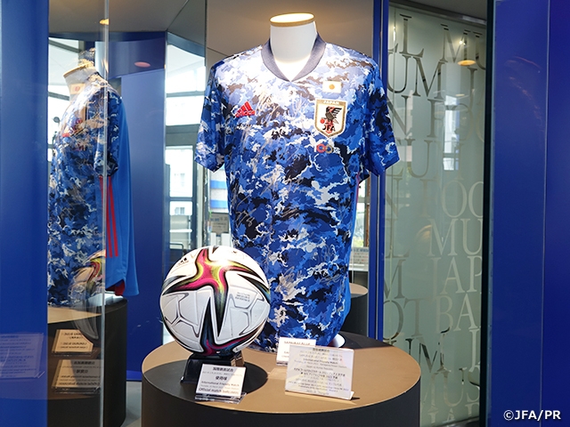 日本サッカーミュージアムにて、SAMURAI BLUE 3月の国際試合のサイン入りユニフォームやシューズを展示