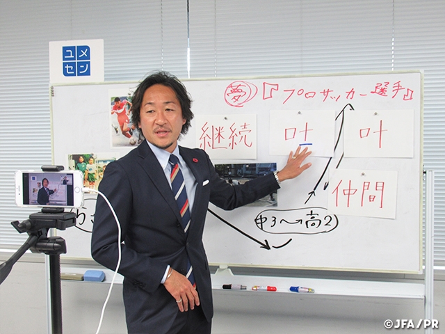 今回登壇したのはJリーグのチーム、横浜F・マリノスやFC東京で活躍した元サッカー選手の石川直宏さん。最初は、夢先生と子どもたちの心の距離を縮める『出会いの時間』からスタートしました。まずは夢先生の現役時代の映像や写真を用いて自己紹介をし、子どもたちは石川直宏さんのプレーに歓声をあげながら視聴し、ゴールが決まるたびに大きな拍手をして盛り上がっていました。