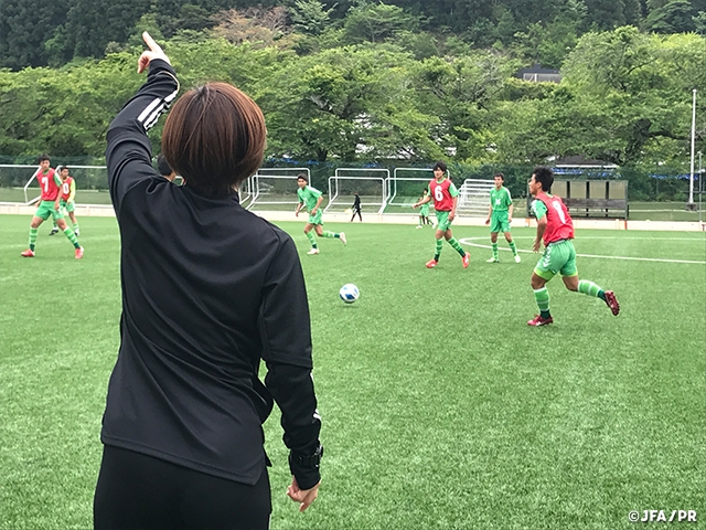 2、3日目は、モジュール(MD)1~4までの指導実践と、その間に行った合計6回のメンタリングの成果を発揮しながら、この日初めて参加してくれた近隣の高校サッカー部の選手を相手に、それぞれが目指すサッカーにこだわりながら、指導実践の総まとめを行いました。