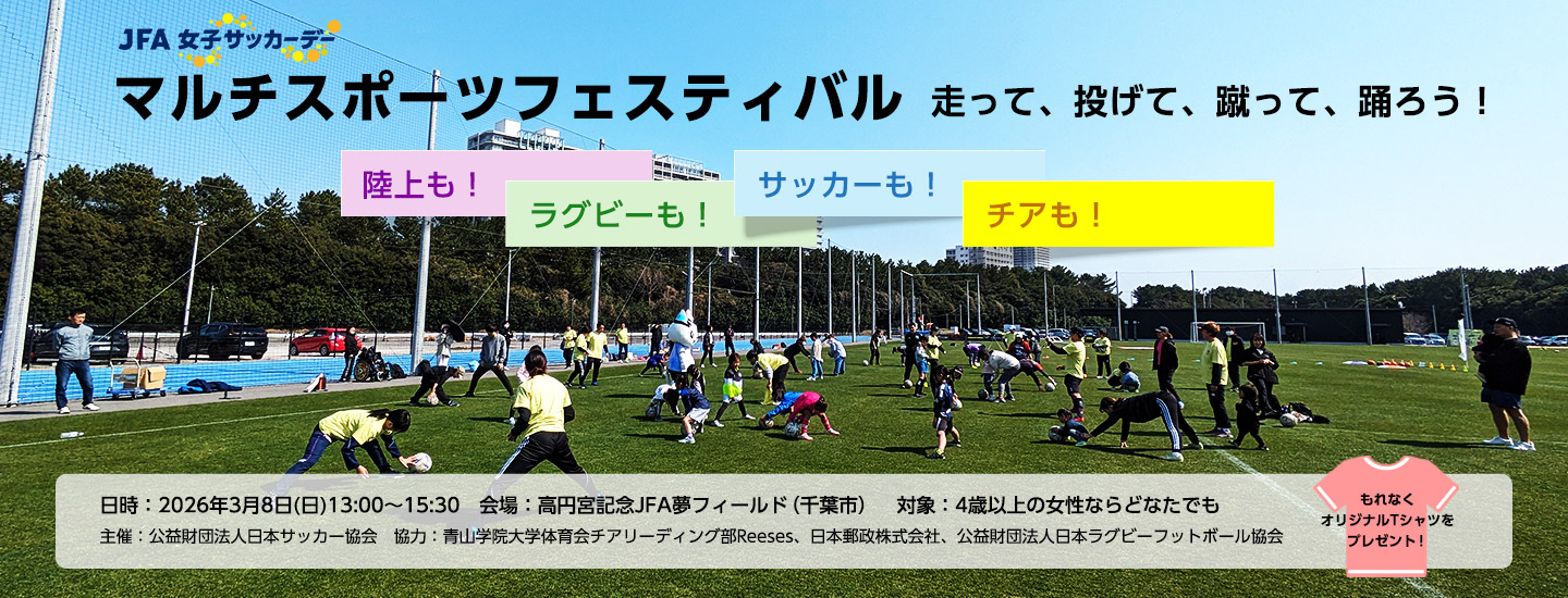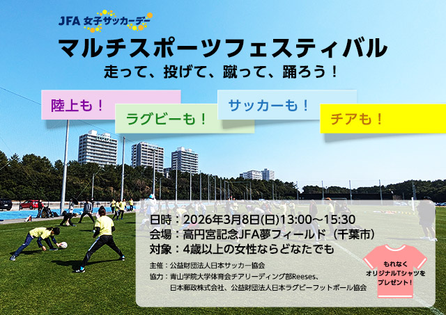 サッカーをはじめ、ラグビー、陸上、チアリーディングなど、さまざまなスポーツを一度に楽しめるイベントで、4歳以上の女性ならどなたでも参加できます。