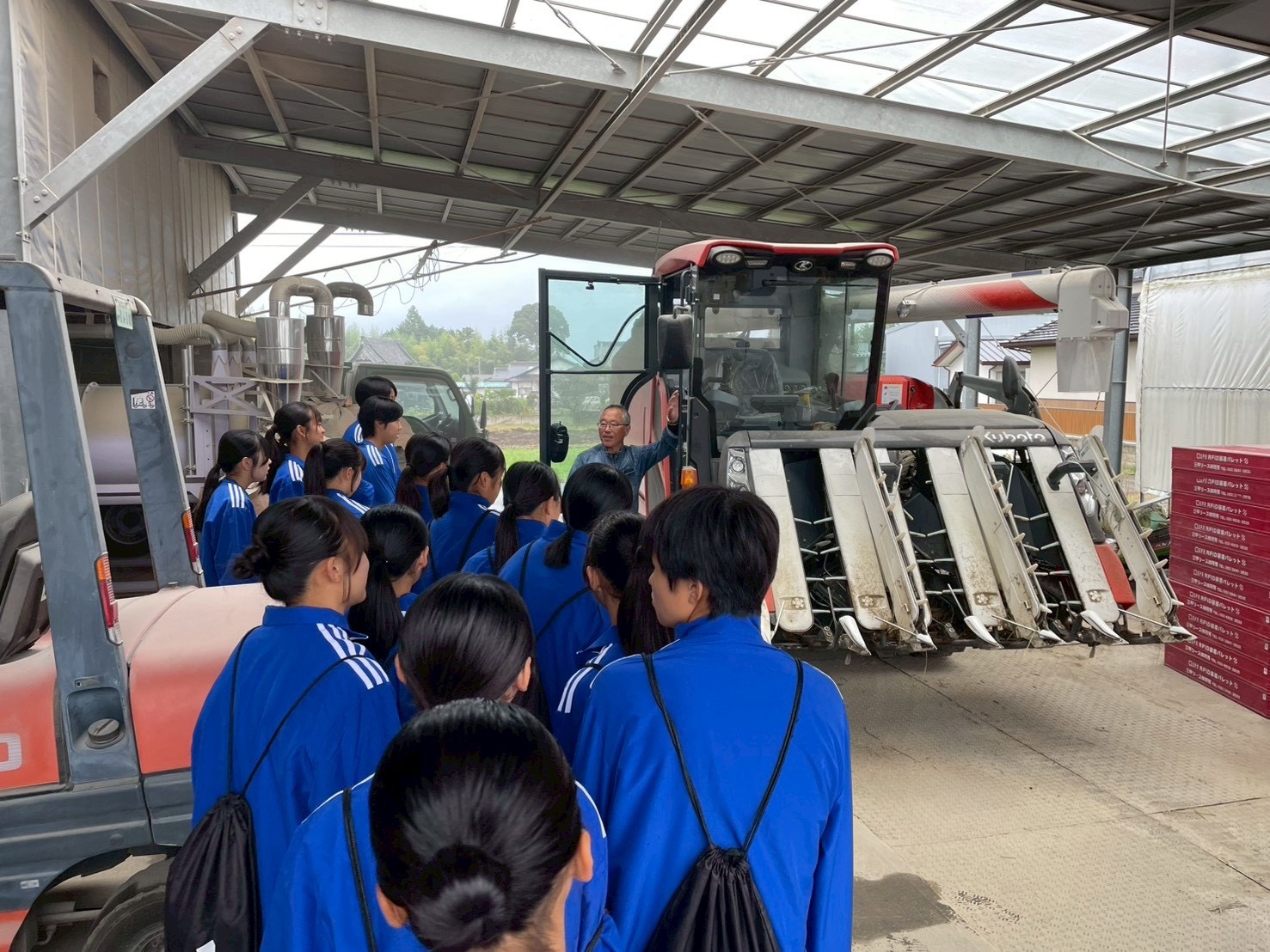 私たちは10月11日にアイデアファームさんで稲刈り学習をさせていただきました。雨だったため、実際に稲刈りをすることはできなかったのですが、稲を刈ってから出荷までの流れなど様々なことを学びました。私はコンバインという、稲を刈る機械を操縦させていただきました。思ったより操縦の方法は単純で、なかなか経験できない貴重な経験になりました。でもこの大きい機会に乗って、実際に田んぼで稲を刈るのは、後ろや手前が見えずらいので、距離感や高さを調整するのが難しそうだなと思いました。また、稲を刈ってから出荷するまでの流れを見て、水分を数パーセント単位で調節する機会や、石などの不純物を取り除く機械があることを初めて知りました。建物内には、大きな機械が約4つもあって、お米が私たちに届くまではこんなにたくさんの工程をつむのだということに驚きました。最後に、この稲刈り学習を通して、農家さんの苦労により美味しいお米ができることを学ことができました。これからは、私たちが毎日食べているお米に感謝して食べていきたいと思いました。