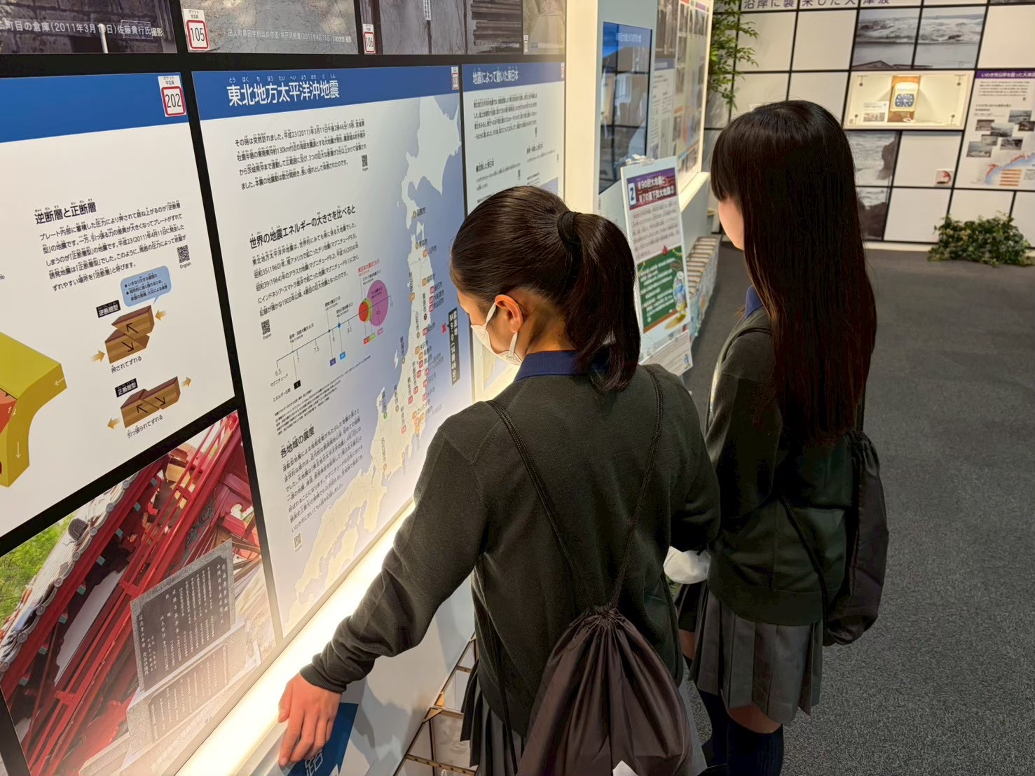 伝承館では、主に津波や地震が起こった後の被害を知ることができました。展示会には津波が来た時刻で止まった時計や黒板があり、その時の状況を肌で感じることができました。その中でも私が一番驚いたことは、地震が起きた時に出来た断層の剥ぎ取り標本があったことです。大きさは約4メートルもありました。説明を聞くとプレート同士の力が大きかったため、大きなズレが生じたとわかりました。他にも、語り部さんのお話を聞きました。話の内容には実体験を元にした、もしもまた大地震が起こった時にどうするべきかを教えてもらいました。その方の話を聞いて、「大丈夫だろう」「どうせすぐおさまる」という一瞬の気の緩みが命取りになってしまうことを学びました。