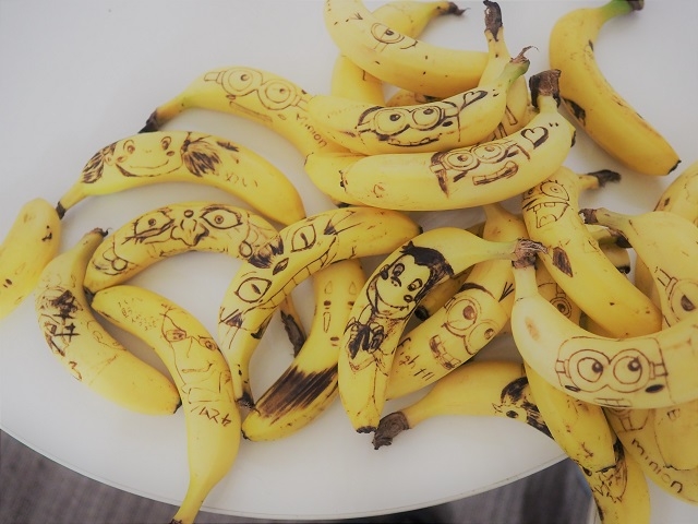 お昼休みは体育大会特製のお弁当です。前日からバナナに仕込みをする総務の大江に群がる選手たち。