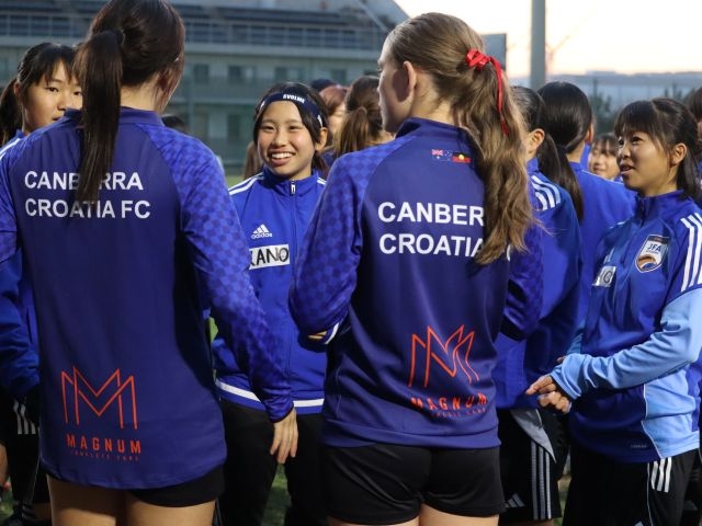 先日のオーストラリアの指導者研修編に続いて、今度は同じくオーストラリアの女子チームとの合同トレーニングの様子です。今回合同トレーニングを行ったのは1月17日18日に行われるJ-GREEN SAKAI Lady's Festival U-15に出場するために来日したCanberra Croatia Deakin EFAです。オーストラリアの首都キャンベラにあるクロアチア系の選手を中心としたクラブチームです。ほとんどが日本の中学3年生と同じ2010年生まれで、2009年・2008年生まれの選手も数名含まれていました。真夏のキャンベラから真冬の日本に到着した翌日だったため、コンディションが心配されまししたが、オーストラリアの選手たちは元気いっぱいでした。覚えたての日本語の単語を使って積極的にコミュニケーションを取ろうとする姿が印象的でした。