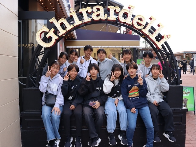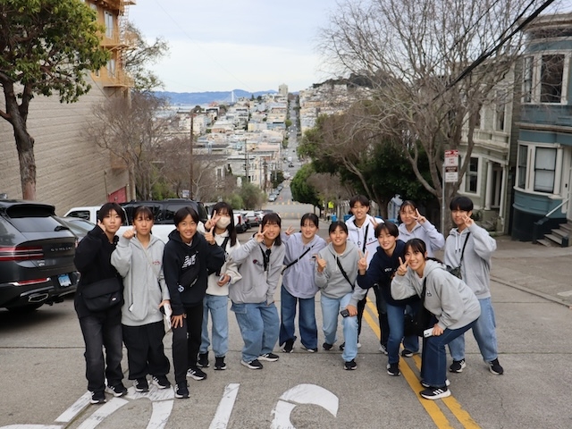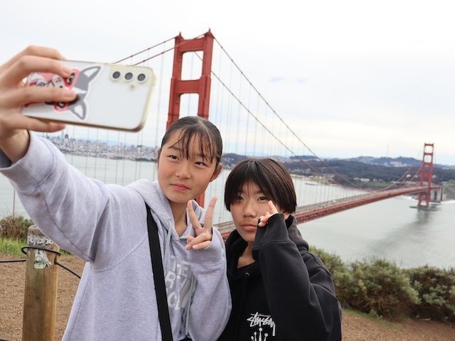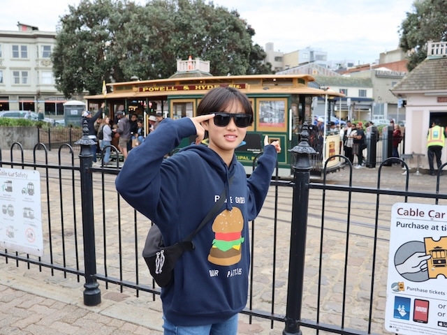 今日はサンフランシスコで観光をしました。初めに船に乗りました。途中から船のスピードがとても速くなってみんな髪の毛が崩れてましが、サンフランシスコの街が見えて来ると景色がとても綺麗でたくさん写真を撮りました。次にゴールデンゲートブリッジに行きました。今までに見たことの無い景色を味わうことができました。アメリカには明石海峡大橋みたいに大きな橋が沢山色々な場所にありました。ゴールデンゲートブリッジの後は2時間ほど自由行動でした。欲しいものが沢山あったけど全部買うとお金が足りないのでしっかり計算しながら買うことができました。最後にみんなでケーブルカーに乗りました。加藤さんが運転手さんにからかわれて、他の乗客たちに紹介されてみんなは大笑いをしていました。アメリカの人はとてもコミュニケーション力が高いなと思いました。私たちは英語があまり得意ではないですが、話すことができるようたくさんの人と残りの時間を大切にたくさん話していきたいなと思います。