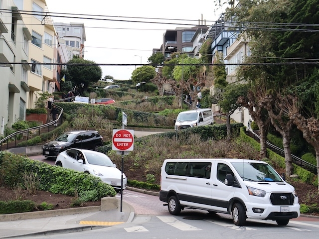 サンフランシスコの観光名所の一つ、ロンバートストリートに向かいます。世界一曲がりくねった通りとして有名です。