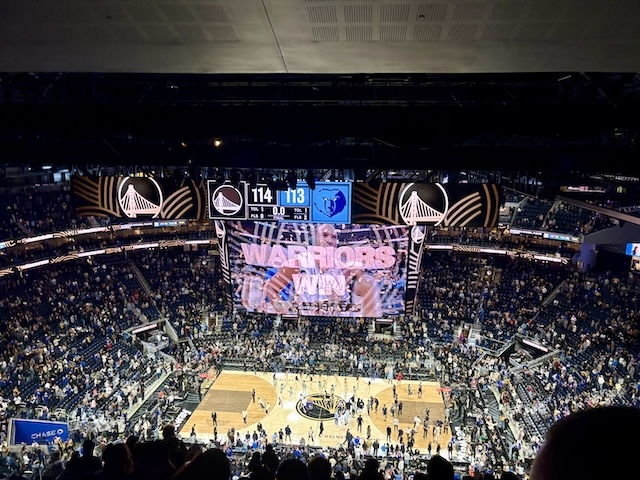 今日はウォーリアーズ対グリズリーズの試合を観ました。私はバスケをやっていたのでNBAを観るのを楽しみにしていました。会場に着くと、迷子になりそうなくらい人がいっぱいいて、改めてすごい人気のスポーツなんだなと思いました。試合が始まると、グリズリーズの選手がフリースローを打つときや、ボールを持ったときにものすごいブーイングが起こっていて、自分だったらアウェイでプレーをしたくないなと思いました。しかし、ブーイングが起きてもちゃんとシュートを決めきるところがすごいなと感じました。最終的には、ウォーリアーズが劇的な逆転劇で勝利をしてものすごく観ていて楽しい試合だったと思いました。また機会があったらNBAを観に行きたいです。
