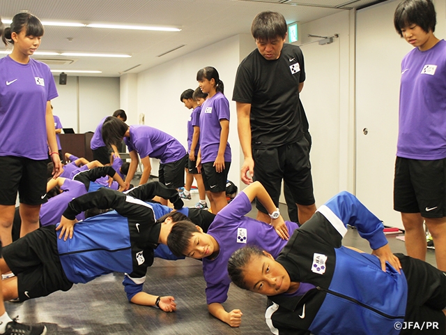 統括責任者である大部コーチのオープニングからスタートしたキャンプ初日。世界基準で闘っていくために、いつでも・どこでも・誰とでも行動できるようにすること、自分からアクション・リアクションすることを伝え、選手たちをピッチに送り出しました。 ピッチでは、フィジカル測定と基本のテクニックトレーニングを行いました。早速自分で周りを見てテキパキと行動できる選手が多く、スムーズに測定を終えることができましたし、ゴールの準備や用具の管理など、コーチが働きかける前に予測して行動を起こすことができていました。トレーニングで行ったトライアングルパスでは、非常に質高くプレーすることができ、日頃のチーム活動や都道府県トレセン、地域トレセンの成果を感じることができました。ロングキックやヘディングではまだまだ課題を抱える選手も多くいますが、全体的にはなでしこらしく明るく直向きにトレーニングに取り組む姿が見れました。夜のレクチャーでは、JFA フィジカルフィットネスプロジェクトの関コーチから、フィジカル測定のフィ ードバックとコアトレーニング、ダイナミックストレッチの重要性をレクチャーしてもらいました。選手がセルフケアできるようになるために、選手同士で正しいフォームを確認しあいながら、合計7種目 のトレーニング・ストレッチの実践も行いました。 緊張の面持ちからスタートしたキャンプでしたが、最後のグループミーティングを終えた後は、すっかり打ち解けた様子でした。明日以降、より切磋琢磨した姿がみられることを期待しています。