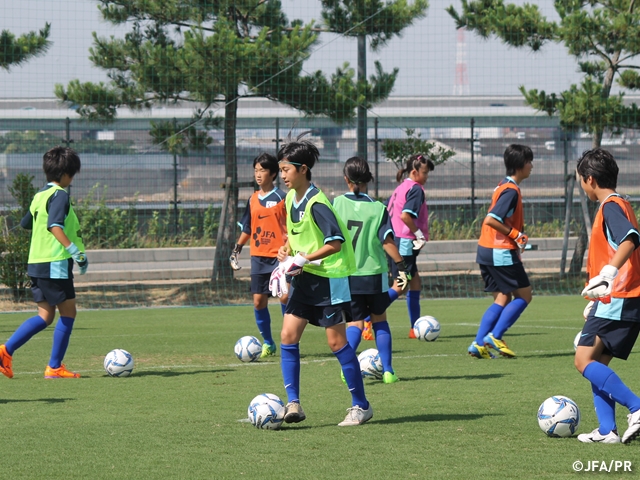 女子GKキャンプ第3回となる今回は、「セレクションキャンプ」として開催しました。日本サッカー協会公式Webサイト「JFA.jp」上で、なでしこジャパン(日本女子代表)のGKを目指す意欲ある参加者を募ったところ、全国から、そして海外から63名の応募があり、その中から選ばれた小学生12名、中学生15名の合計27名で実施しました。台風の影響で沖縄からの2選手は合流が遅れたものの、快晴となった大阪で元気にキャンプをスタート。