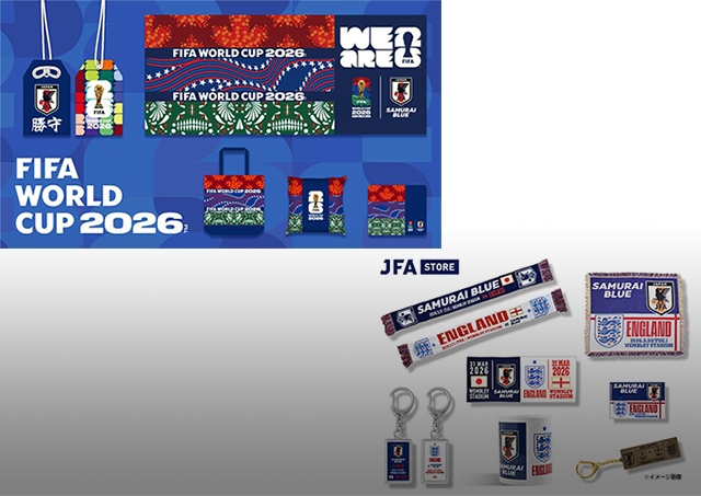 サッカー日本代表オフィシャルグッズ FIFAワールドカップ2026の大会ロゴを使用したオフィシャルグッズと3.31イングランド代表戦のマッチデーグッズを販売