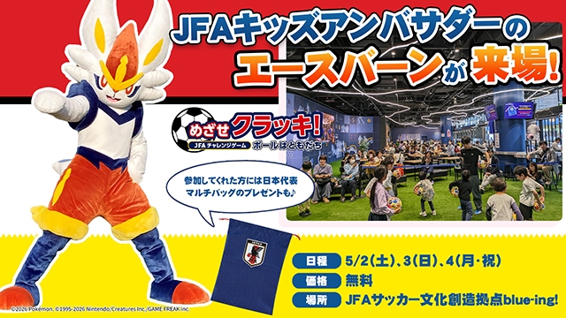 「めざせクラッキ!」は、さまざまな運動の基本となる動作や走ったり跳んだりする動作、手・足を使ったボール遊びなど、子どもたちの成長に必要な動きや身体の動かし方を楽しみながら身につけられるプログラムです。用意された6つのステージに沿って楽しみながら挑戦することができます。今回はGW特別企画として、JFA キッズアンバサダーのエースバーンが登場し、一緒にイベントを盛り上げます。ご参加いただいた方には、日本代表マルチバッグをプレゼントします。