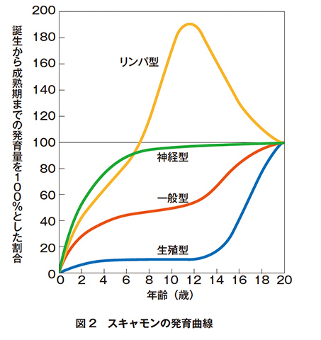 サッカー選手としての戦うためのからだづくりには、からだの土台を築く時期である幼少のころから成人に至るまでに健全な成長を促し、健康的なからだをつくることが大切です。小学生から高校生の時期は身長と体重の増加が大きく【図1】、またからだの臓器や器官の発育も大きい時期【図2】です。からだが成長する時期に、正しい生活習慣と十分な睡眠、そして十分なエネルギーと栄養素のとれる食習慣を身につけることが、サッカーに必要な運動能力を獲得するために必要です。からだは食べ物からできています。毎日の食事が戦うためのからだをつくるために重要な役割を果たしています。