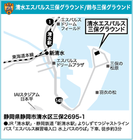 ●JR「清水駅」・静岡鉄道「新清水駅」よりしずてつジャストラインバス「エスパルス練習場入口 水上バスのりば」下車、徒歩約3分