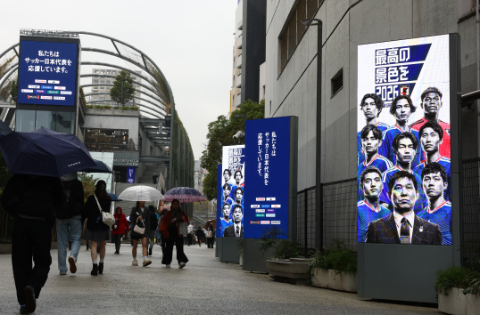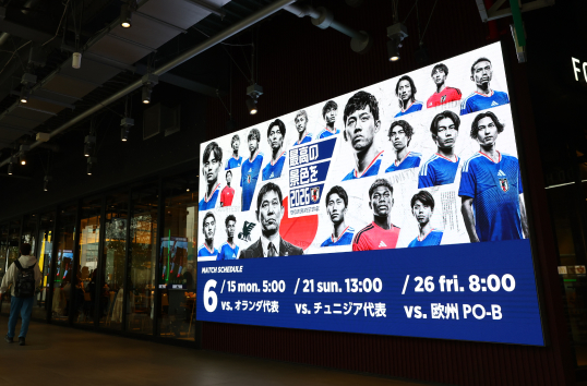 MIYASHITA PARK全館のデジタルサイネージをジャックして、日本代表パートナー各社の応援広告を展開!またサッカー日本代表「最高の景色を2026」オフィシャルアンバサダーのJI BLUEも応援広告に参加。